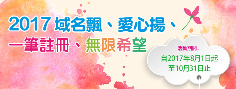 即日起至10月31日期間,至參與本活動之受理註冊機構網站,新申請或續用一筆.tw/.台灣網域名稱,TWNIC與參與本活動之受理註冊機構即提撥網域名稱管理費用3%作為愛心公益基金,並於活動結束後匯集善款共同捐贈予公益團體。